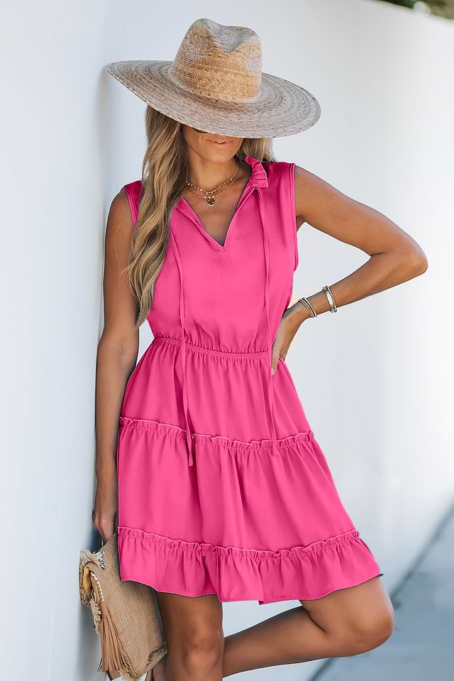 El elegante minivestido rosa combina a la perfección estilo y gracia. Con un escote con muescas y un divertido ribete de volantes, este minivestido es tan seguro como chic.