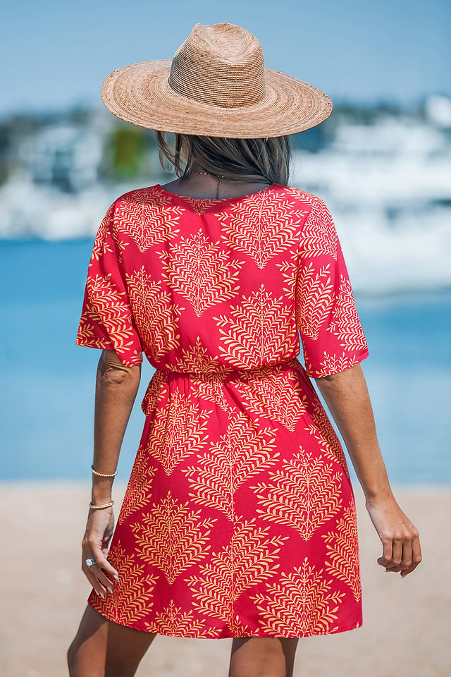 ¡Disfruta de un estilo relajado con el minivestido tropical Soft Fern! Su escote cruzado, mangas cortas y largo mini lo hacen ligero, relajado y fácil de combinar.