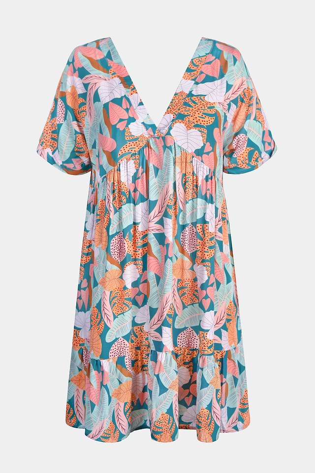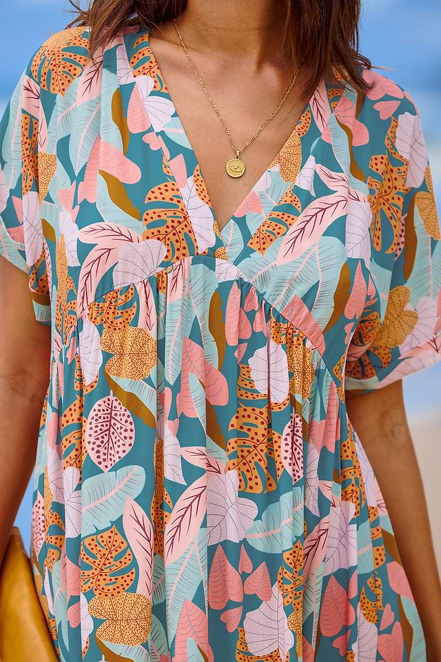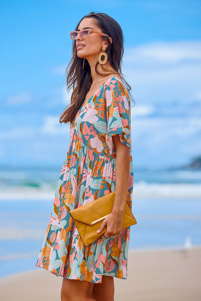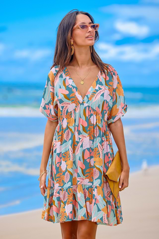 El minivestido de manga corta Soft Tropics es una opción serena para los días cálidos con sus tonos suaves, perfecto para salidas relajadas o reuniones informales.