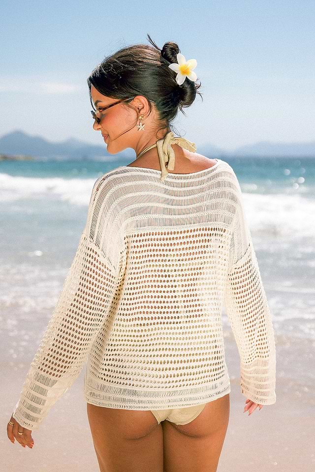 El top playero beige básico para vacaciones es cómodo y relajado, perfecto para días de relax bajo el sol. Con cuello redondo y mangas largas, este estilo sencillo es ideal para relajarse junto a la piscina y disfrutar de momentos de relax en la playa.