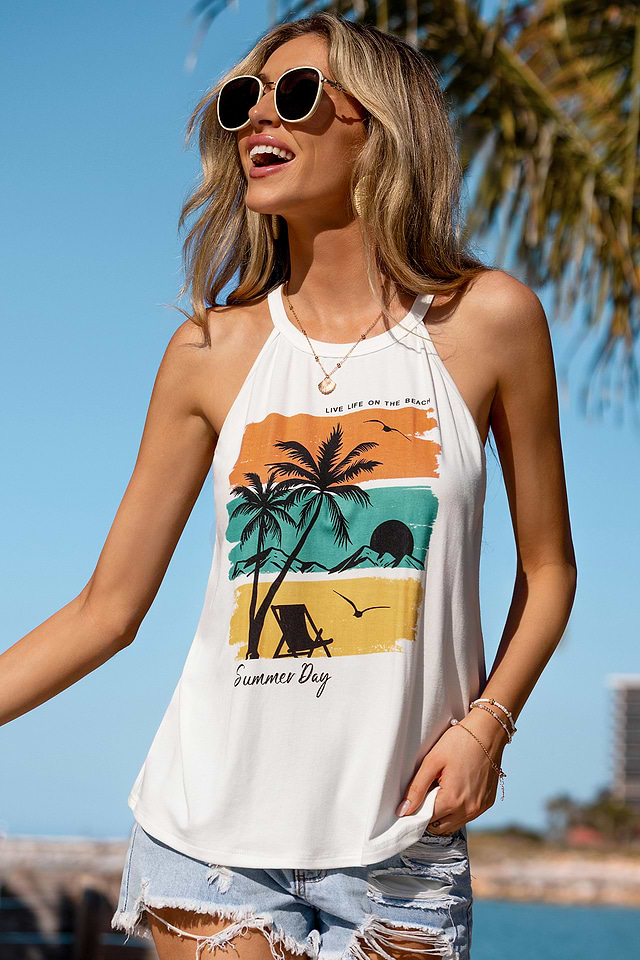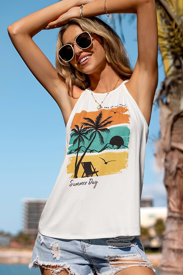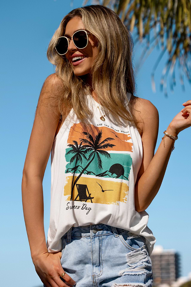 ¡La camiseta de tirantes Summer Day Graphic aporta un toque divertido a cualquier look! Su escote redondo sin mangas y un estampado gráfico playero se combinan para crear una prenda informal y cómoda, perfecta para los días soleados.