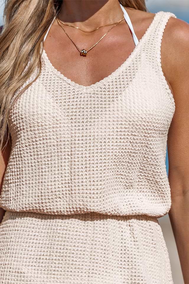 El diseño de punto abierto es ligeramente transparente, especialmente en colores claros. Ideal para llevar sobre un traje de baño o con una capa ligera debajo. ¡Disfruta de una elegancia natural con el vestido playero Summer Oasis Beige! Esta elegante prenda presenta un favorecedor escote en V y una tela suave y texturizada con una caída perfecta. Perfecto para usar sobre un traje de baño o solo, ¡te sentirás fresca y segura todo el verano!