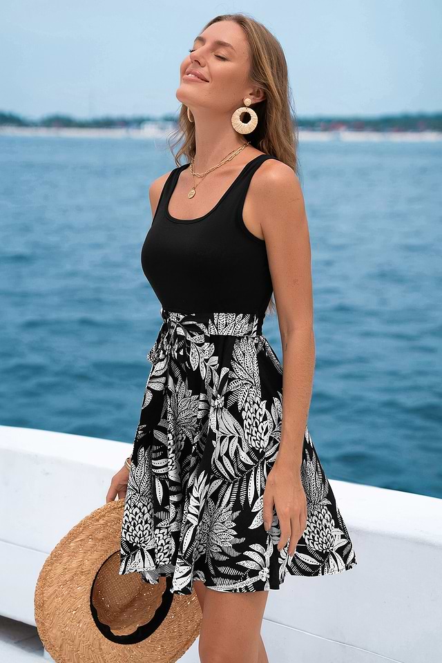 El minivestido tropical Sunset Escape es tu prenda ideal para un look tropical informal. Este minivestido presenta un favorecedor escote cuadrado sin mangas y un lazo en la cintura para un ajuste perfecto.