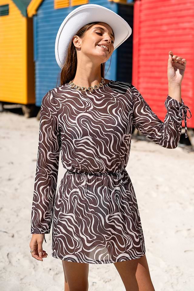 El minivestido Mocha Drift Abstract Cover-Up aporta un toque natural y relajado a tus looks playeros. Su escote redondo y mangas largas lo hacen cómodo y versátil, mientras que su tejido trenzado y su largo mini le dan un aire ligero y desenfadado con un toque artístico.