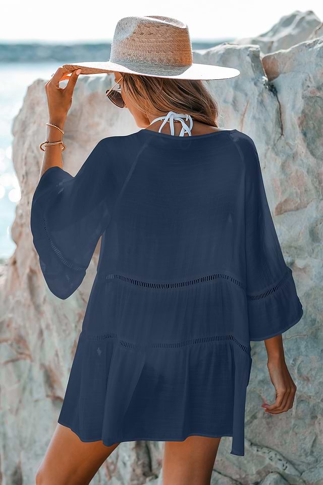 El minivestido azul marino Twilight Tide es una opción ideal para lucir un look playero elegante. Con escote con muescas, media manga y botones en la parte delantera, este minivestido combina estilo y comodidad para los días relajados de verano.