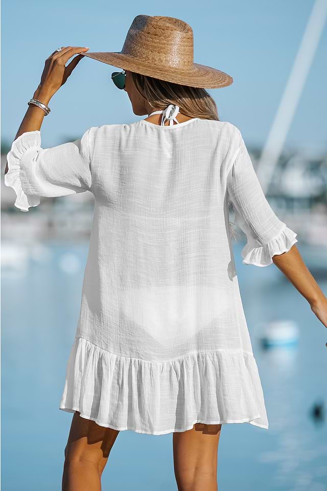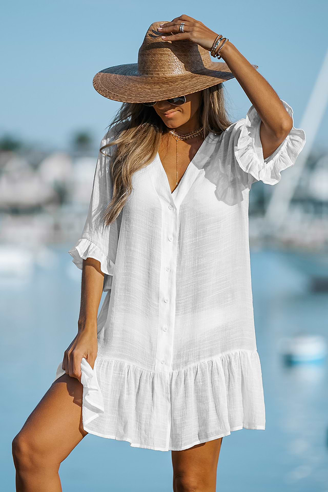 Túmbate junto a la piscina con este vestido de baño tejido con escote en V, mangas cortas caídas, cierres delanteros con botones, ribete de volantes y bajo midi. Código del producto: CAA07B2M013CC