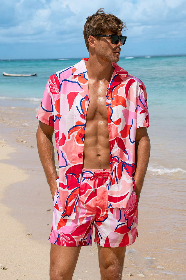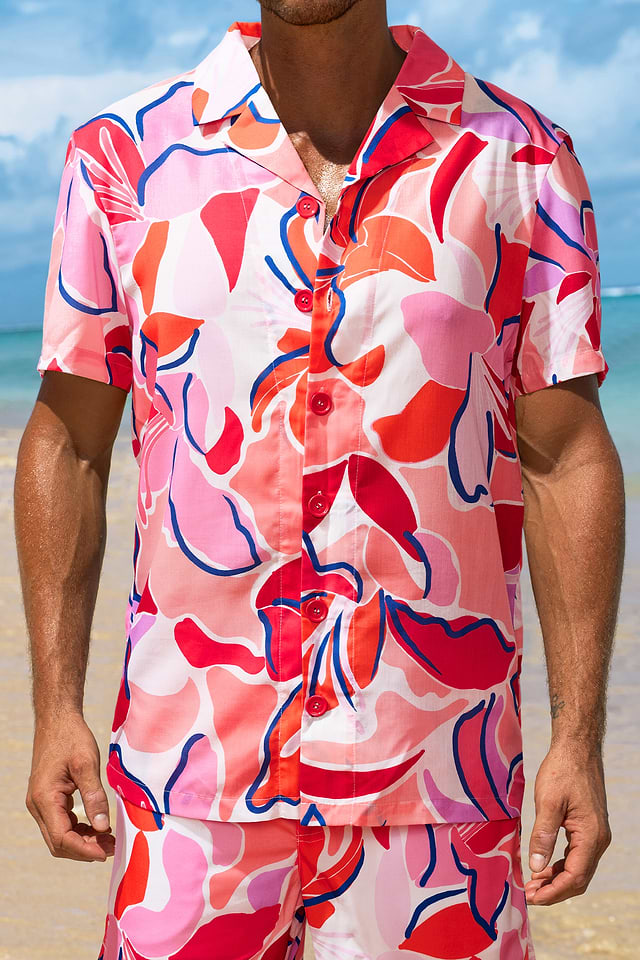 ¡Esta camisa tropical aporta un toque tropical vibrante a tus planes para el buen tiempo! Su cuello clásico y mangas cortas le dan un aspecto elegante, mientras que el cierre de botones le da un acabado impecable a este estilo estructurado y fácil de llevar.