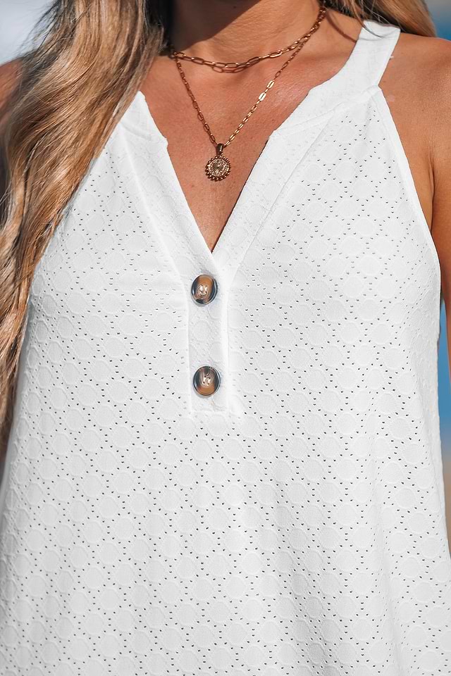 Relájate con estilo con el minivestido blanco con escote entallado. Con un diseño sin mangas con escote entallado y detalle de botones, este minivestido es la combinación perfecta de estilo y comodidad.
