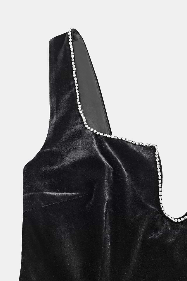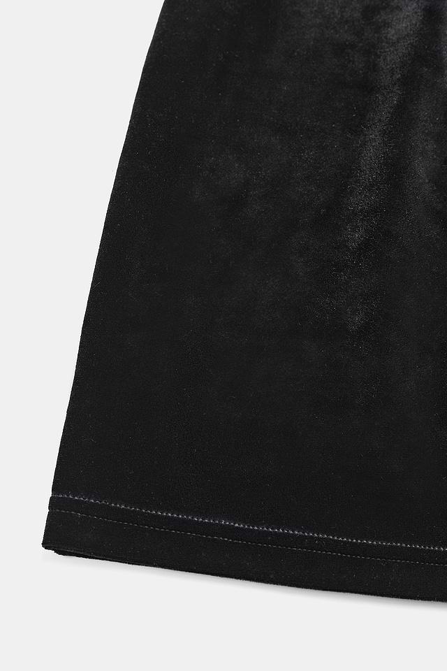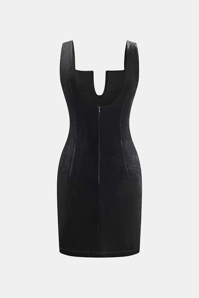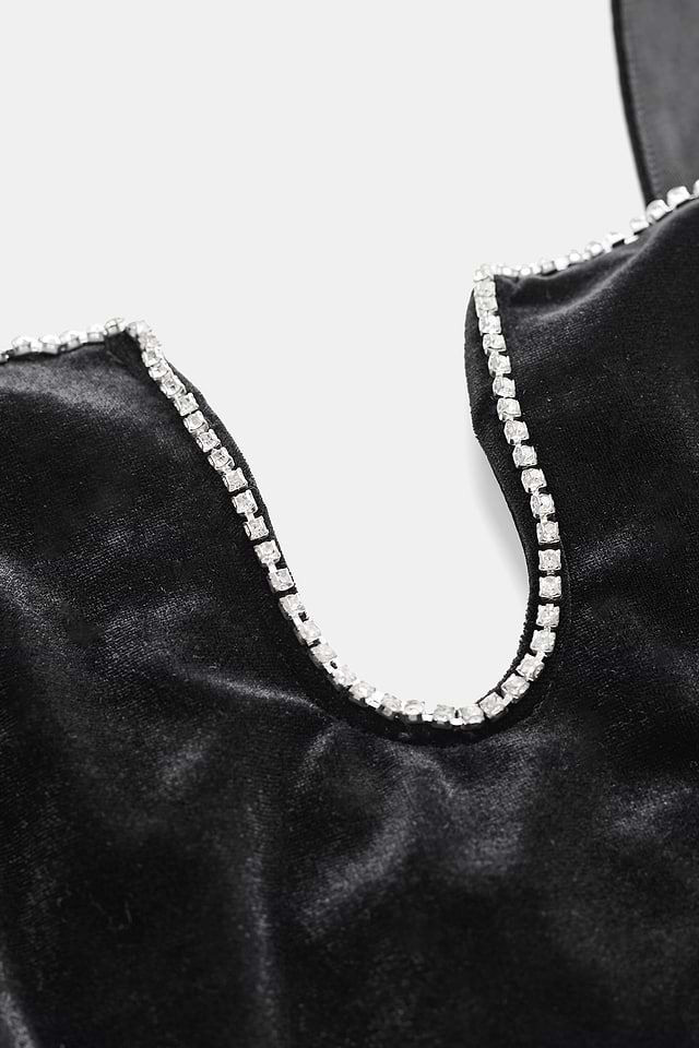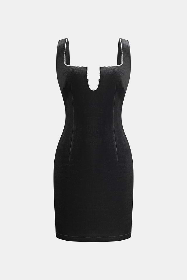 Brilla con una sutil sofisticación con el minivestido de terciopelo negro con adornos de cristales. Este minivestido, confeccionado en terciopelo suave y lujoso, presenta adornos de cristales alrededor del escote que le aportan un toque de brillo perfecto para las celebraciones navideñas. El intenso tono negro y la silueta ajustada lo hacen elegante sin esfuerzo, ya sea que estés en una fiesta o en una salida nocturna con amigos.
