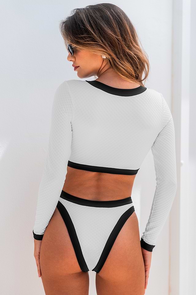 El conjunto de traje de baño Bon Voyage le da un toque sofisticado a la energía surfera. El top de manga larga presenta escote redondo, copas suaves extraíbles y un soporte de busto medio para una cobertura que se adapta a tus movimientos. La braguita de tiro medio equilibra el look con un corte extra alto en la pierna y una cobertura extra pronunciada en el trasero, diseñada para disfrutar del sol y las olas.