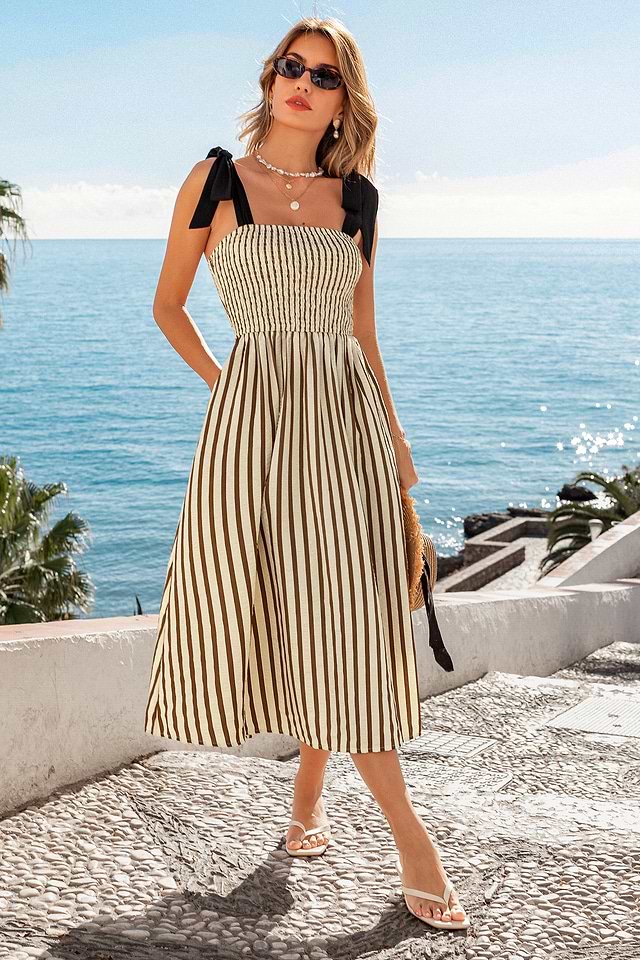 El vestido midi de rayas Y-Axis es estructurado y a la vez divertido, con rayas que dinamizan el movimiento. Su escote cuadrado, corte sin mangas, corpiño fruncido y largo midi le dan un toque moderno y coqueto.